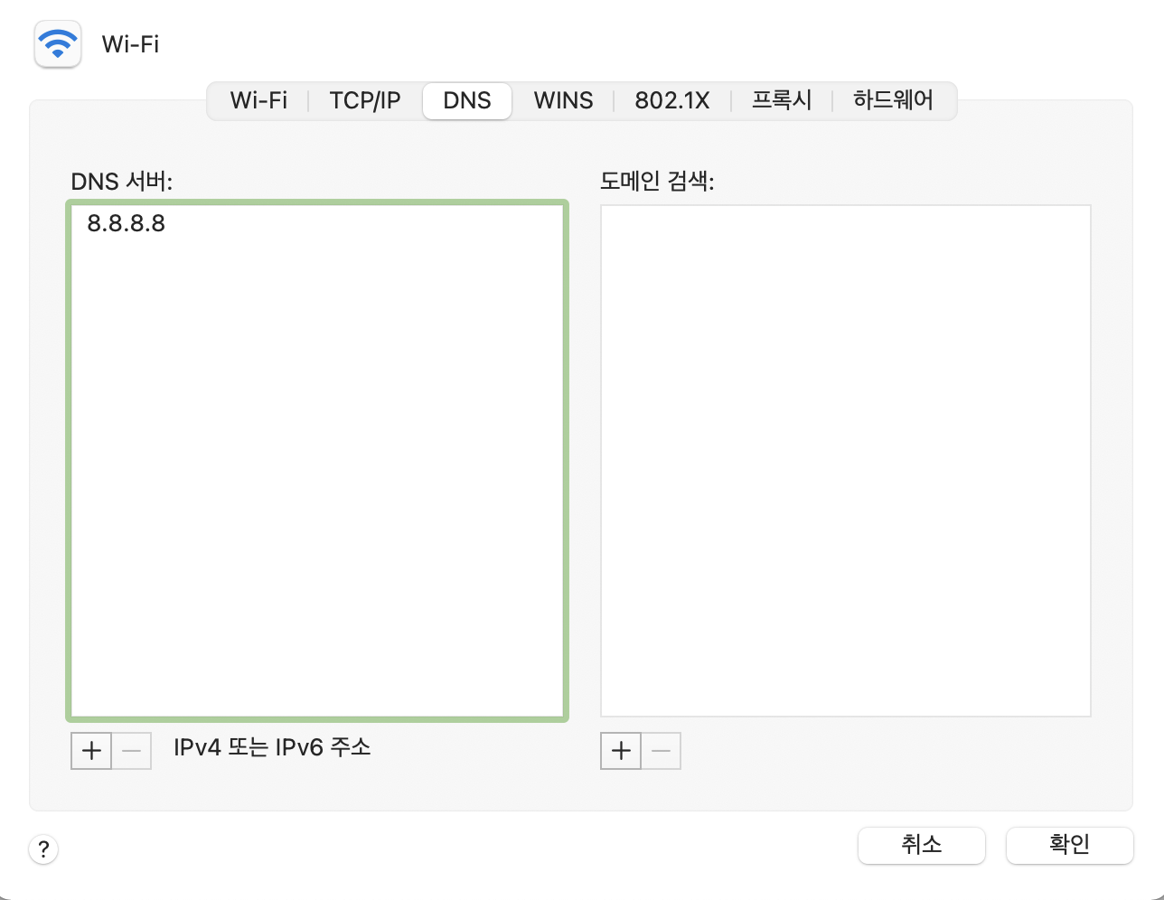 DNS 탭에 8.8.8.8을 넣어줍니다. ( https://developers.google.com/speed/public-dns/docs/using )