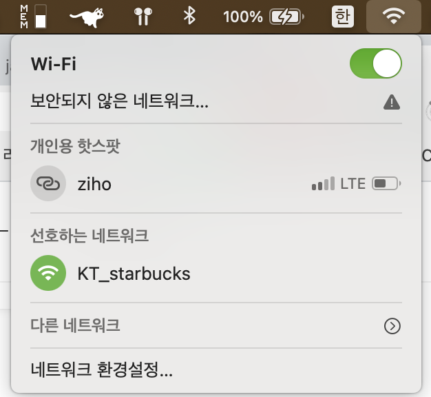 상단 와이파이를 클릭하고 네트워크 환경설정을 클릭합니다.